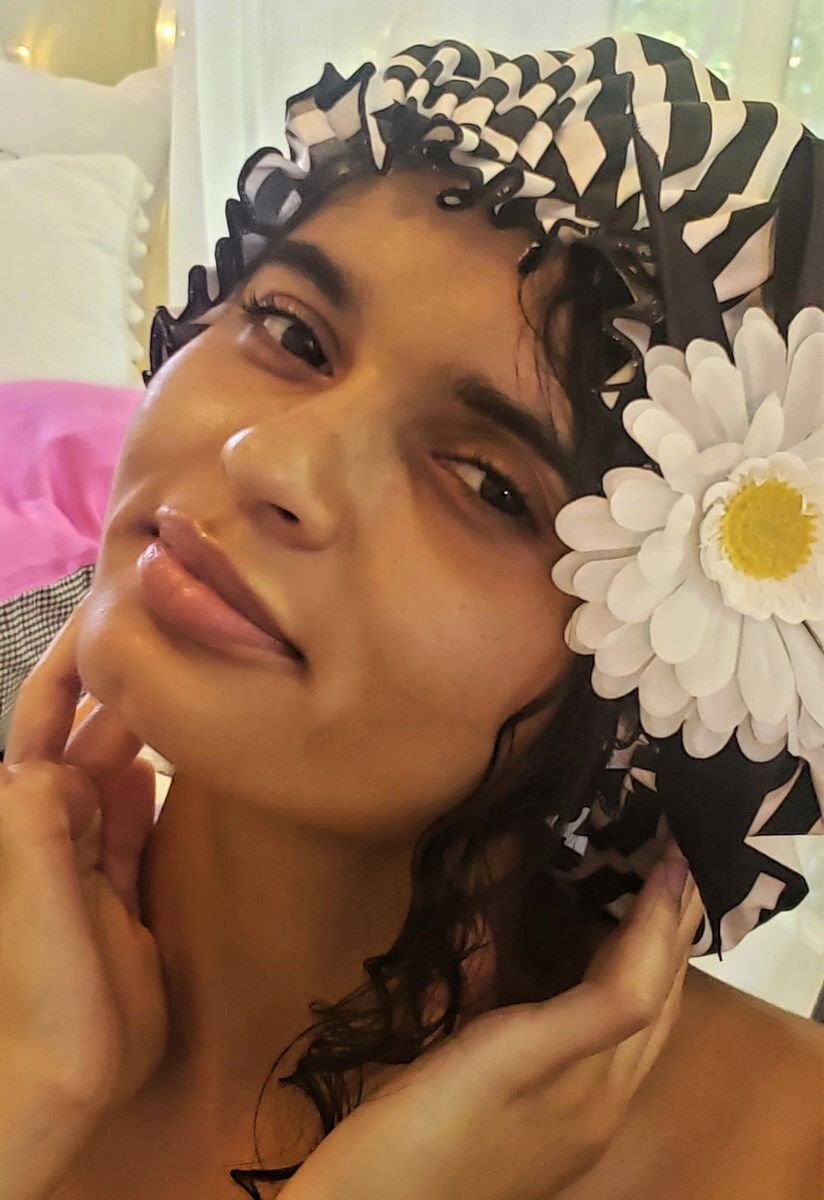 Our classic stripe shower cap cotton over soft vinyl black satin bow and big daisy that is removeable with velcro. This style started it all 30 plus years ago at Mimi A La Mode!